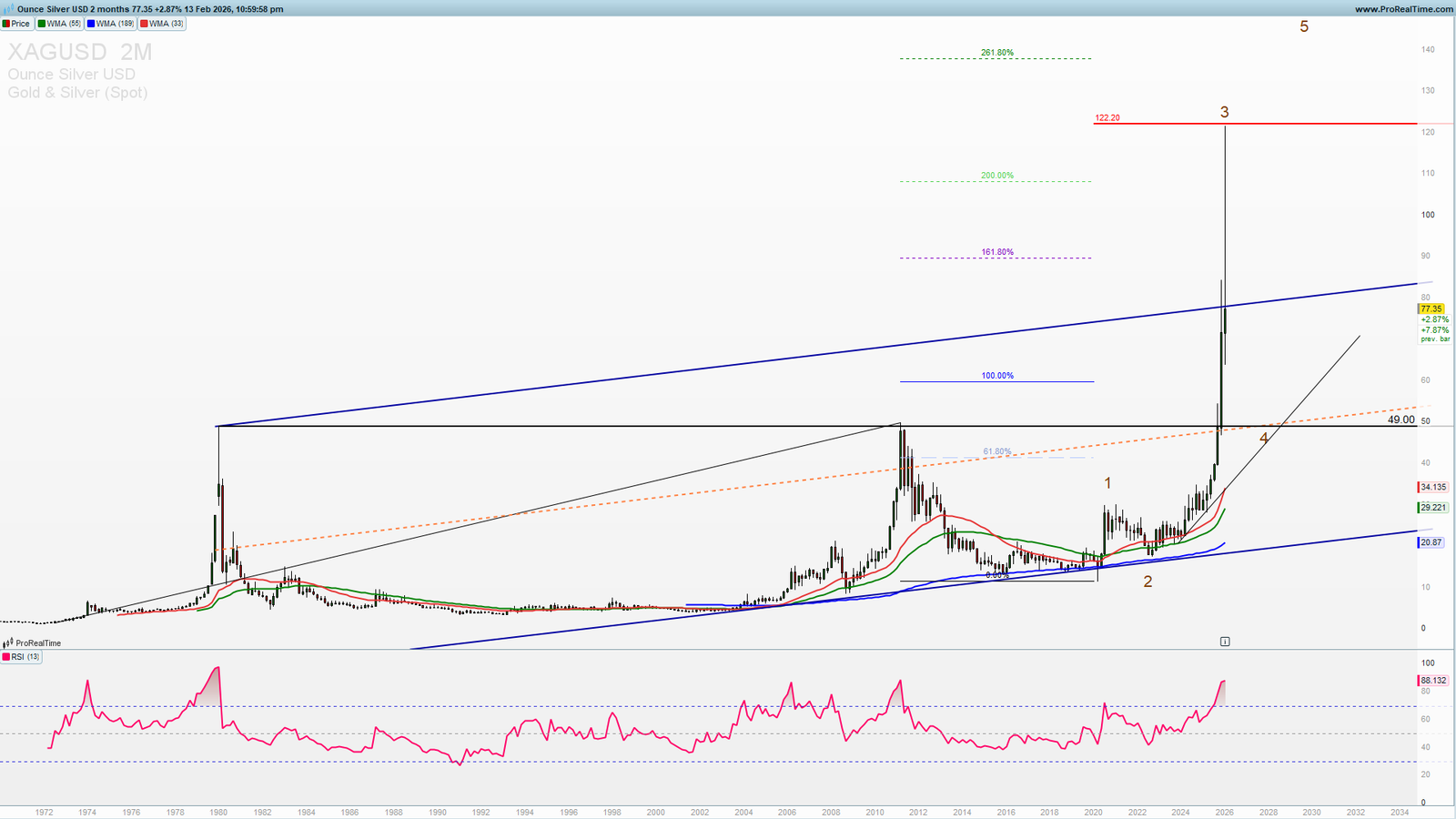 Silver reached a parabolic top of 122 and has been rejected. This cause a sharp reversal back into the long-term uptrend channel beneath 80. Silver bulls lost momentum due to a strong take profit and short covering as many investors got scared because of a sharp parabolic rise. That reasoning is completely justified looking at the price action and historical tops in 1980 and 2011.